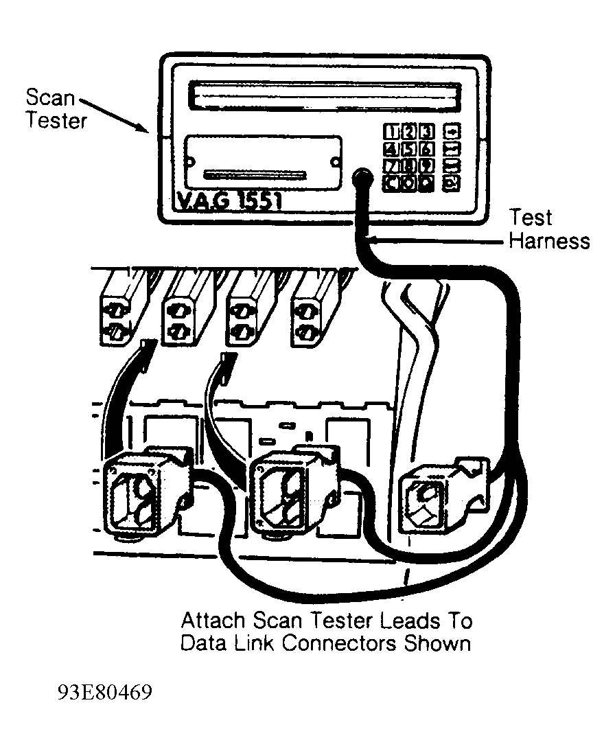 - Connect Scan Tester (VAG 1551) to Data Link Connectors (DLC). On Golf III and Jetta III, DLCs are located below A/C-heater control panel. On EuroVan, DLCs are located in fold-down storage shelf in front of relay panel. See Fig 1 . Connect Black scan tester connector first, wait for VAG SELF-DIAGNOSIS (EuroVan) message, then connect White scan tester connector. DO NOT connect Blue scan tester connector.