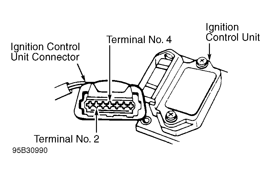 2. Battery voltage should be present. If battery voltage is not present, ensure continuity exists between terminal No. 2 and ground. Continuity must also exist between terminal No. 4 and ignition coil positive terminal. Repair wiring if necessary. If wiring is okay, replace ignition control unit.