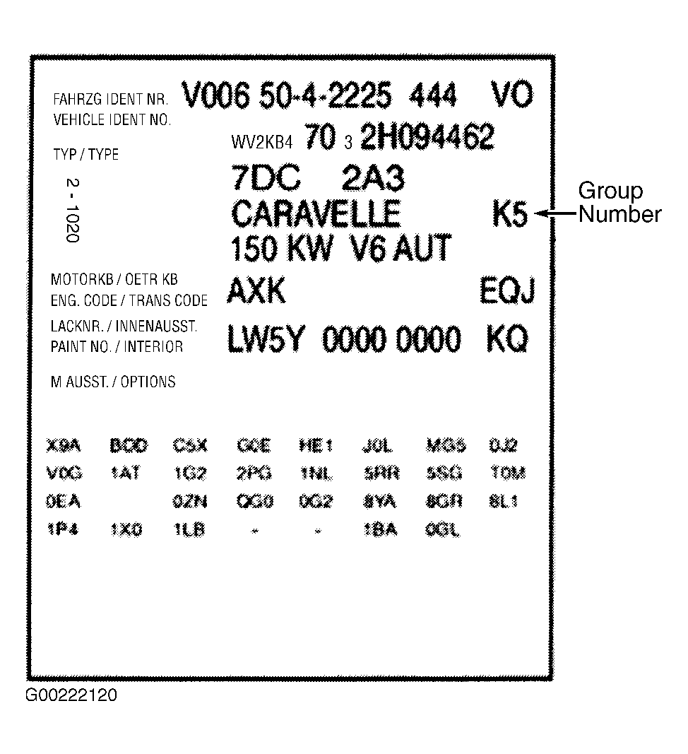 Group numbers 1-8 exist at this time. Group number identify to which vehicle group a vehicle belongs. The word "CARAVELLE" on the vehicle data plate is an example. Another word can also be printed in this location, e.g. "KOM". Use illustration to aid in locating vehicle group number. See Fig 2 .