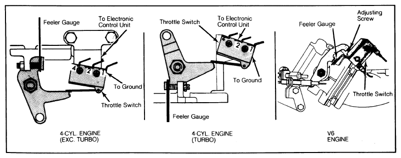 4. Using feeler gauge listed in Throttle Switch Voltage Reading chart should produce voltages indicated in chart. If not, replace throttle switch and adjust as follows: