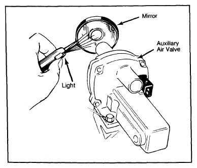 - Disconnect hoses from auxiliary air valve. Use a mirror and small flashlight to inspect valve. See Fig 1. At room temperature, valve should be slightly open. If equipped, disconnect wires from air flow sensor. With ignition switch "ON" valve should cover opening within 5 minutes.