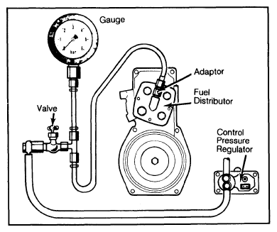 - Install a pressure gauge to perform fuel pressure tests. On all models, pressure gauge is installed between the control pressure regulator and the center fitting on fuel distributor. See Fig 1.