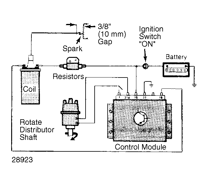 - If spark jumps gap, check distributor cap, rotor, cables, and spark plugs. Be sure ignition timing and fuel system are OK. If no sparks occur, perform the following tests.