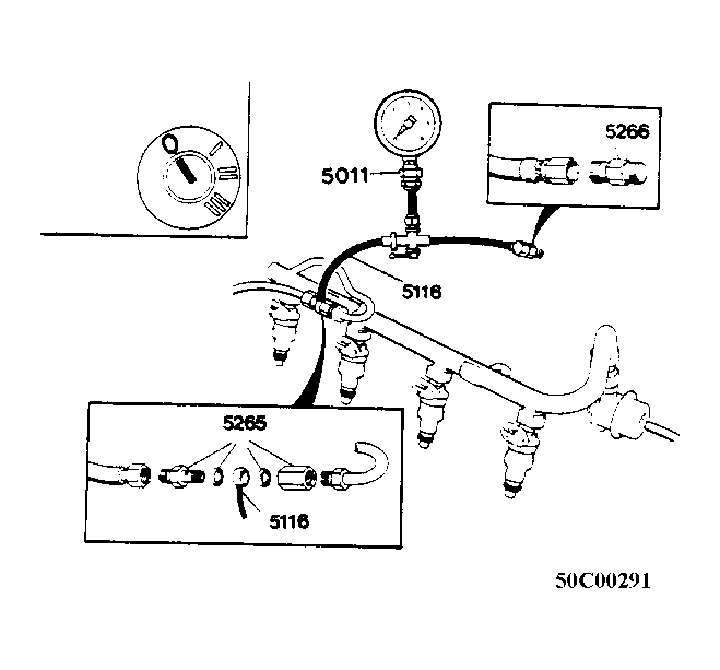 1. Connect pressure gauge 5011, See Fig 1 . Turn ingintion off. Hold a piece of absorbent paper underneath fuel line to prevent spillage. Connect gauge between fuel line and fuel distribution rail. Use hose 5116 and adapter 5265, See Fig 1 . Plug gauge hose with 5266, See Fig 1 . Turn gauge cock to position 1 (pointing towards hose 5116), See Fig 1 .