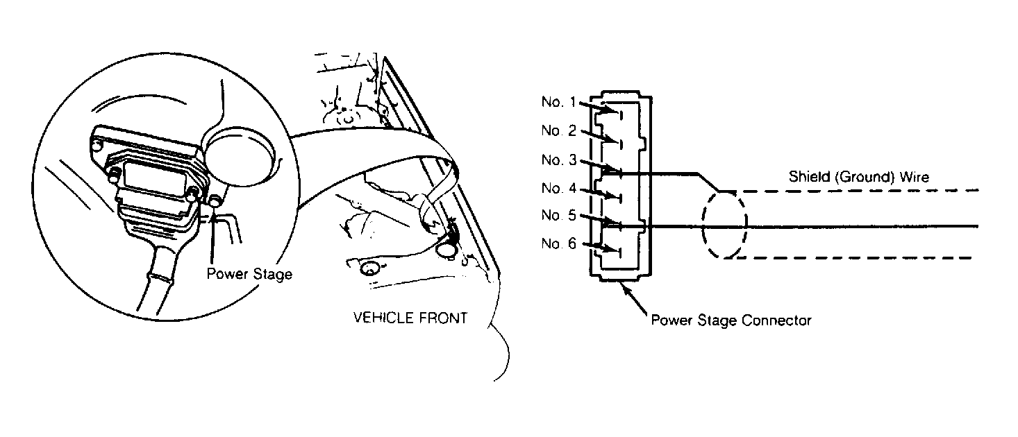 - Check shield (ground) wire between ignition ECU and power stage. See Fig 1 . Shield wire should be connected to power stage connector pin No. 3. Repair if necessary. Ensure power stage is receiving signal from ignition ECU. Disconnect wires from ignition coil terminal No. 1. Connect multimeter positive (+) lead to stage connector pin No. 5 and negative (-) lead to ground.