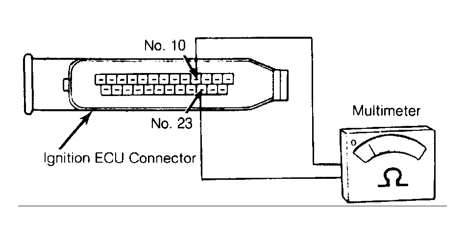 - Attach voltmeter positive (+) lead to ignition ECU connector terminal No. 6 and negative (-) lead to ground. Turn ignition on. Voltage should be approximately 12 volts. Check resistance of engine RPM position sensor by connecting ohmmeter leads to ignition ECU connector terminals No. 10 and No. 23. See Fig 3 . Resistance should be 500-600 ohms. Ensure shield (ground) wire is connected to ECU connector terminal No. 11.