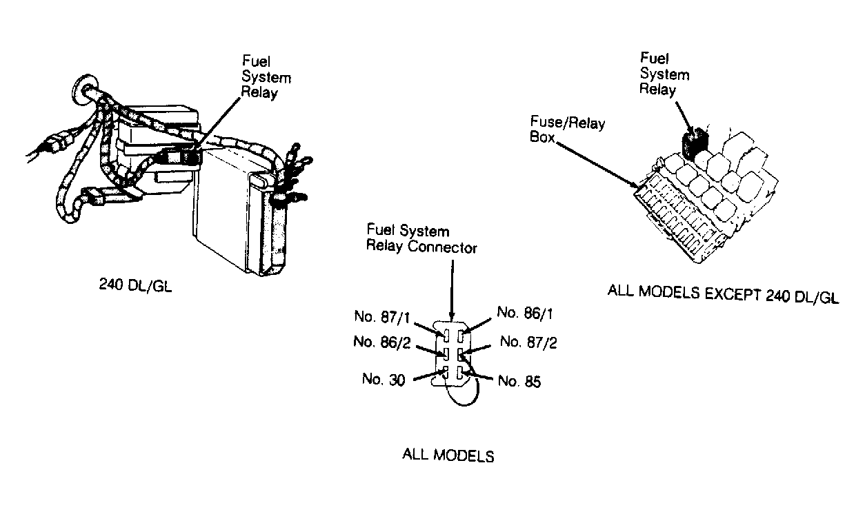 3. On all models except 240 and 240 DL, remove fuel system relay. Fuel system relay is located in fuse/relay box. See Fig 1 .