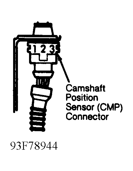 - Connect voltmeter between CMP connector terminal No. 3 and ground. Turn ignition on. About 10 volts should be present. Turn ignition off. Connect an ohmmeter between CMP connector terminal No. 1 and ground. Ohmmeter should show about zero ohms. If voltage supply and ground are okay, repeat test using new CMP. If voltage supply and ground are not okay, reconnect intake hose and go to step 9).