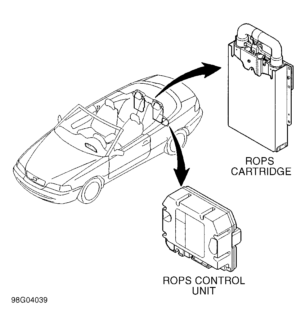 In the event of a roll-over, the ROPS control unit deploys roll bars from the ROPS cartridges located behind rear passenger seats to their maximum extension of 20 inches. See Figure . When the ROPS control unit senses a roll-over, in addition to deployment of roll bars, all 4 seat belt tensioners are tightened within a fraction of a second to eliminate any slack, preventing passengers from being ejected from the vehicle.