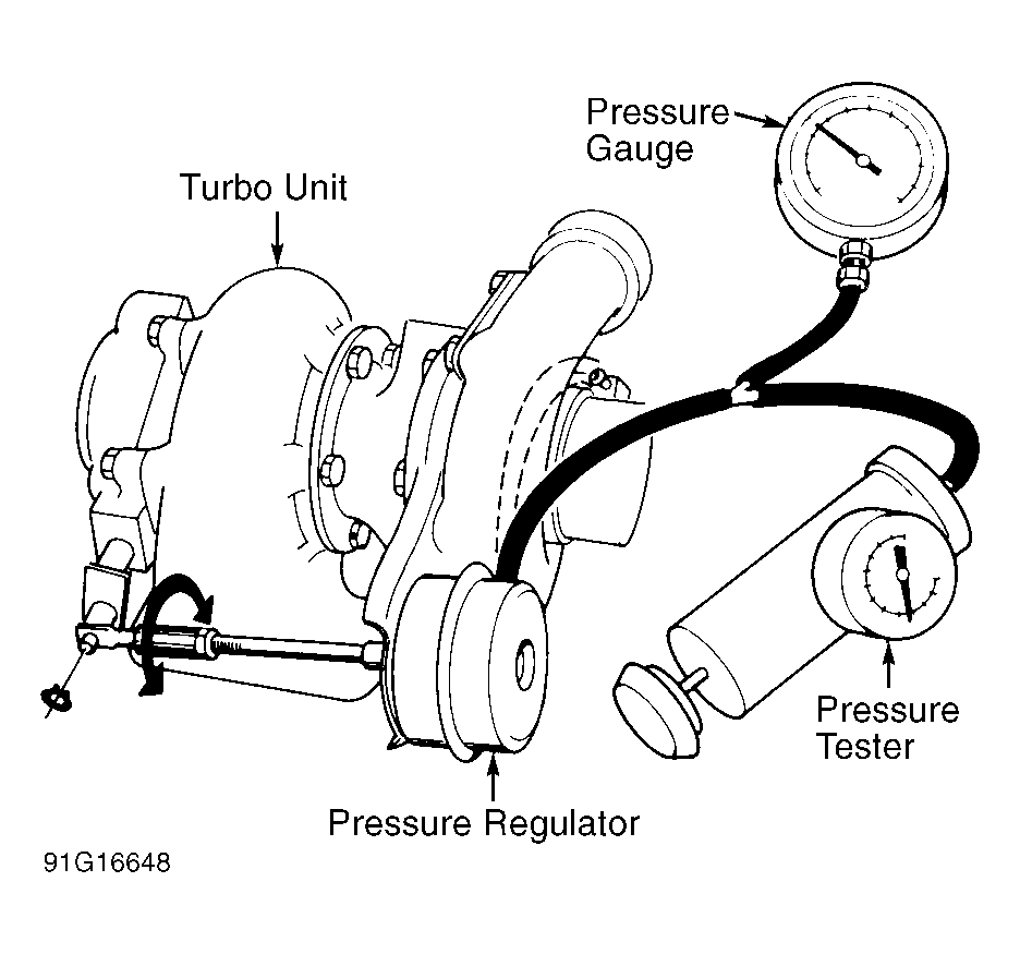 ) to pressure regulator. See Fig 1. Increase pressure to 1.7-1.9 psi (11.7-13.1 kPa). Press wastegate lever against turbine housing, closing wastegate valve.