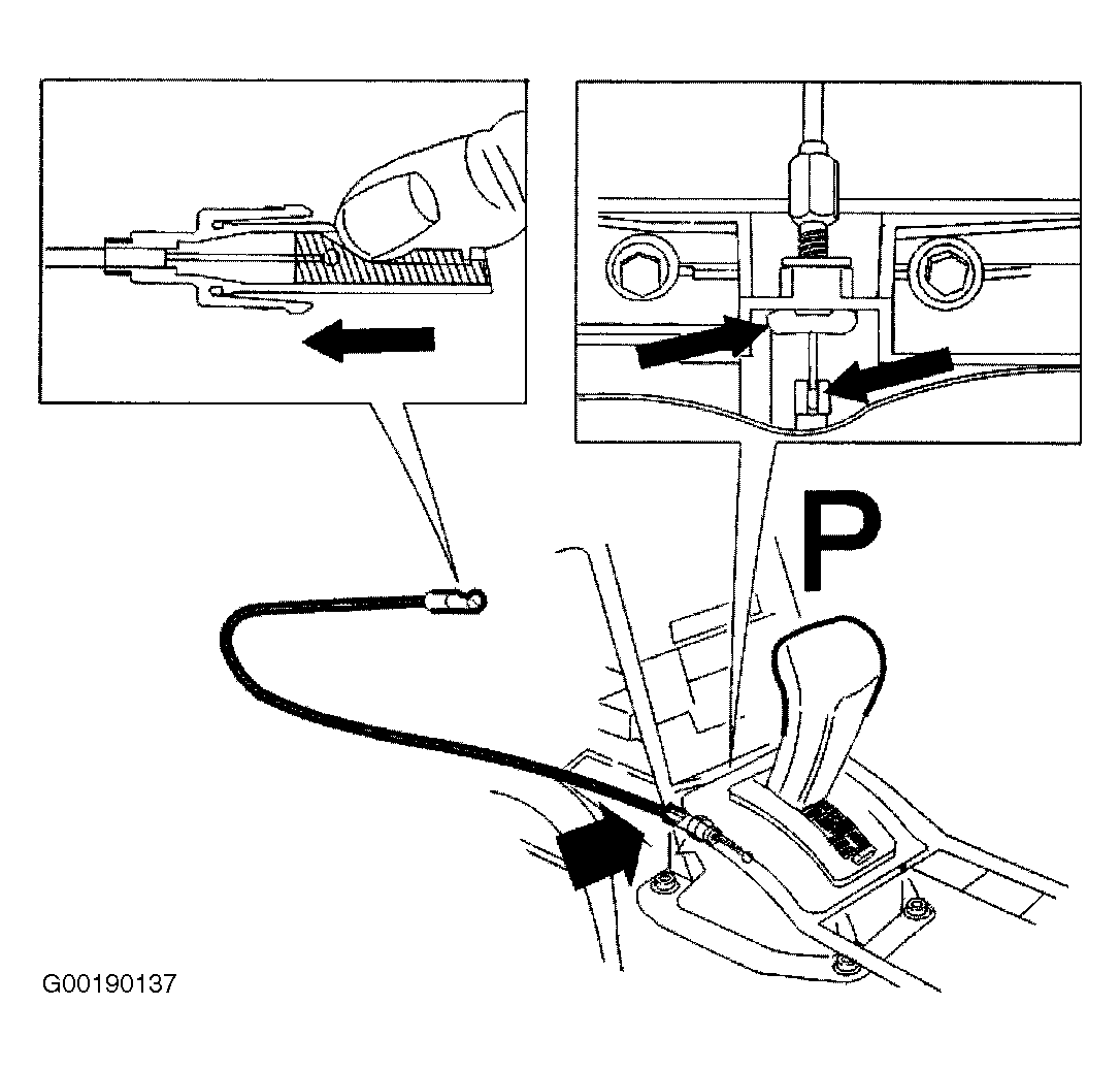 - Press in locking tabs on cable end. Press in locking tab so cable can be hooked easily onto gear selector lever arm. Release locking tab. See Figure .