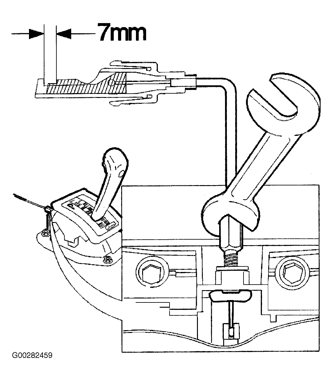 - Ensure that ball on cable end is properly seated. Move gear shift lever from Park to another position. Adjust cable at lever end until clearance between locking tabs at ignition switch end is approximately .276" (7 mm). See Fig 1 . Move gear selector lever to Park. Check that clearance between cable and gear lever arm at selector end is approximately .02" (0.5 mm).