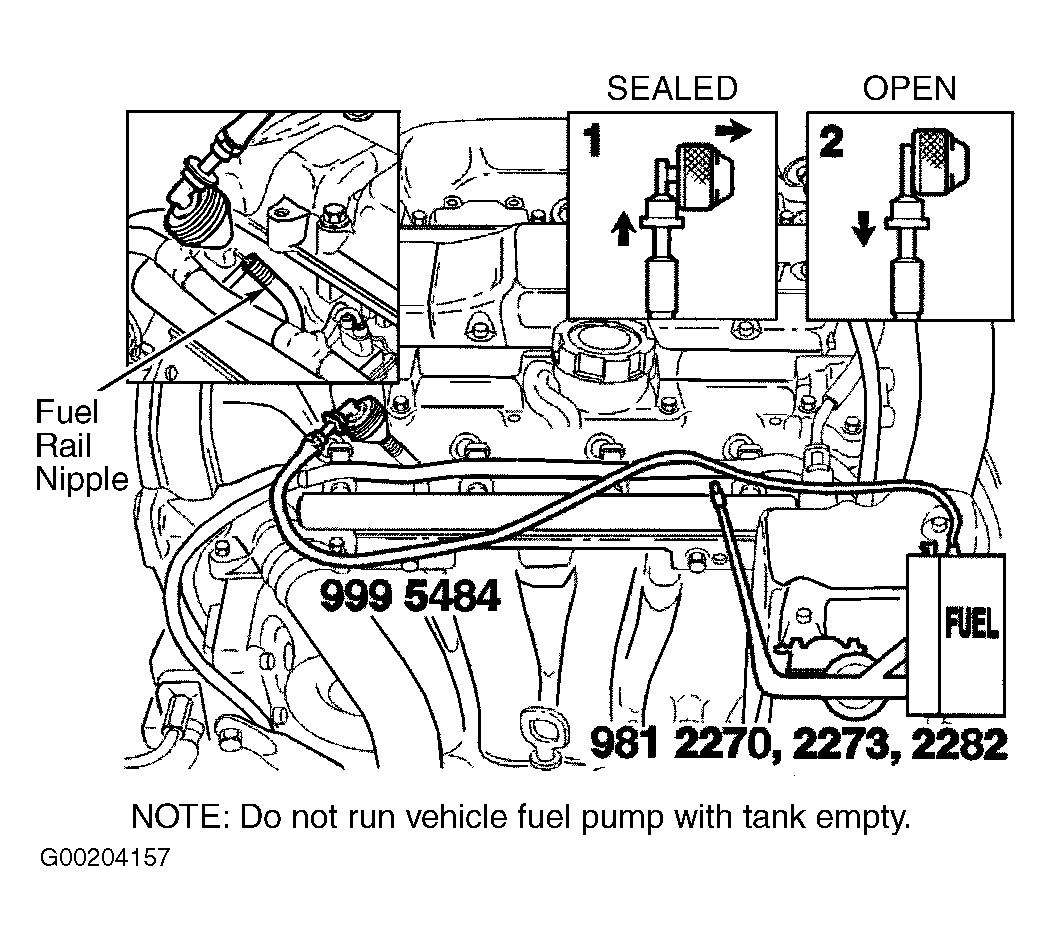 - Remove throttle pulley cover. Remove shield over valve on fuel rail. Connect Adapter (999 5484) to Fuel Drainage Unit (981 2270, 2273 and 2282). See Figure. Connect adapter to valve on fuel rail, ensuring adapter is in locked position. Start fuel drainage unit. Unlock adapter. Raise and support vehicle.