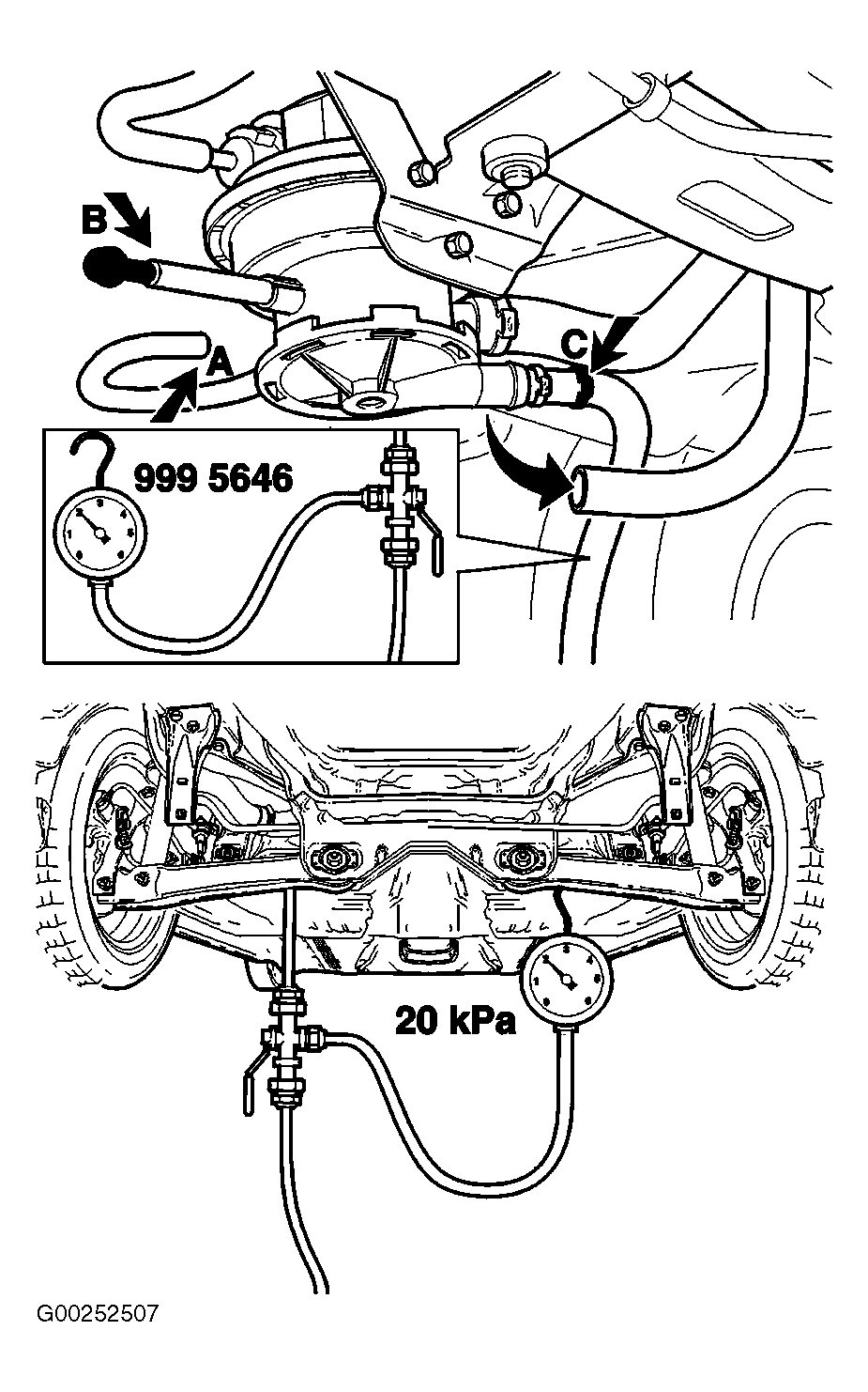 - Raise and support vehicle. Disconnect leak diagnostic pump rear hose marked "A" and fit a piece of hose and plug over the hose connection. Disconnect pump front hose marked "C" and fit Pressure Regulator (999-5646) to pump. See Fig 1.NOTE: Hang manometer vertically to ensure accurate measurement.