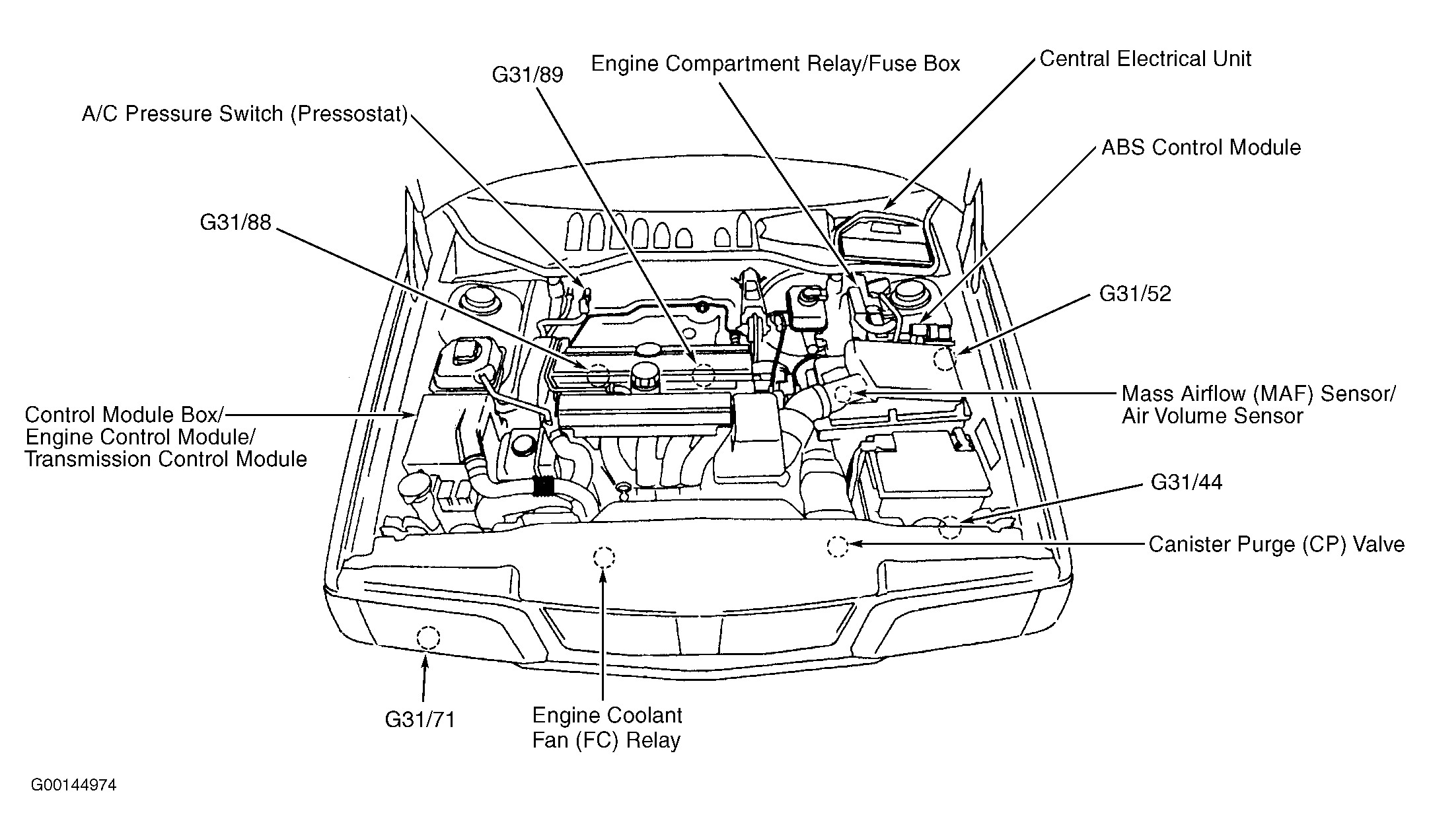 Engine Compartment Relay/Fuse Box On left rear of engine compartment, next to strut tower. See Figure .