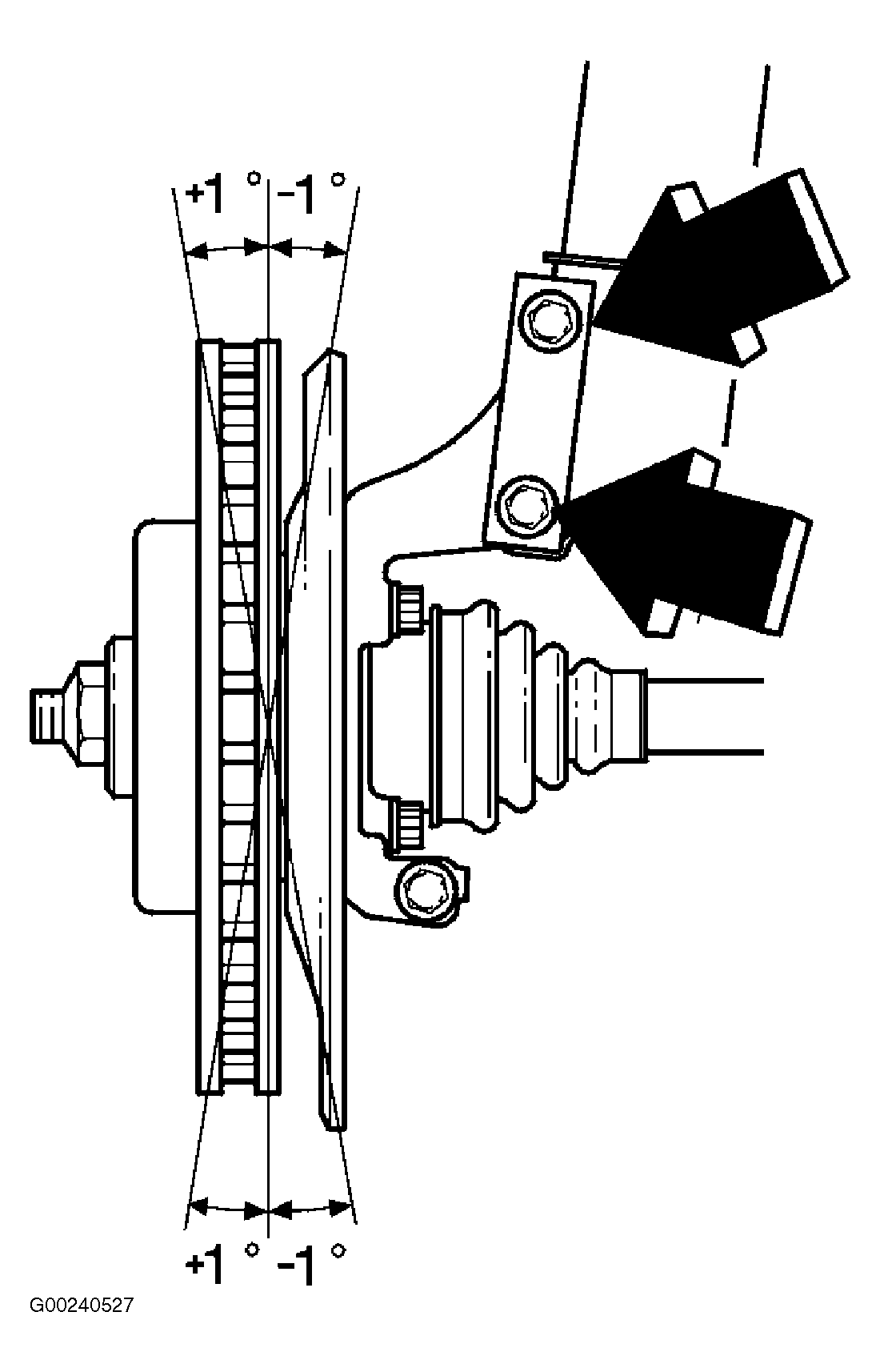 - Raise car and remove wheel(s). On vehicles with sleeves in the stub axles, remove the upper sleeve. If necessary, remove both sleeves from the stub axle, depending on how large the adjustment needs to be. A sleeve gives an angle change of approximately 0.5°. For both sleeves the change is approximately 1°. See Fig 1