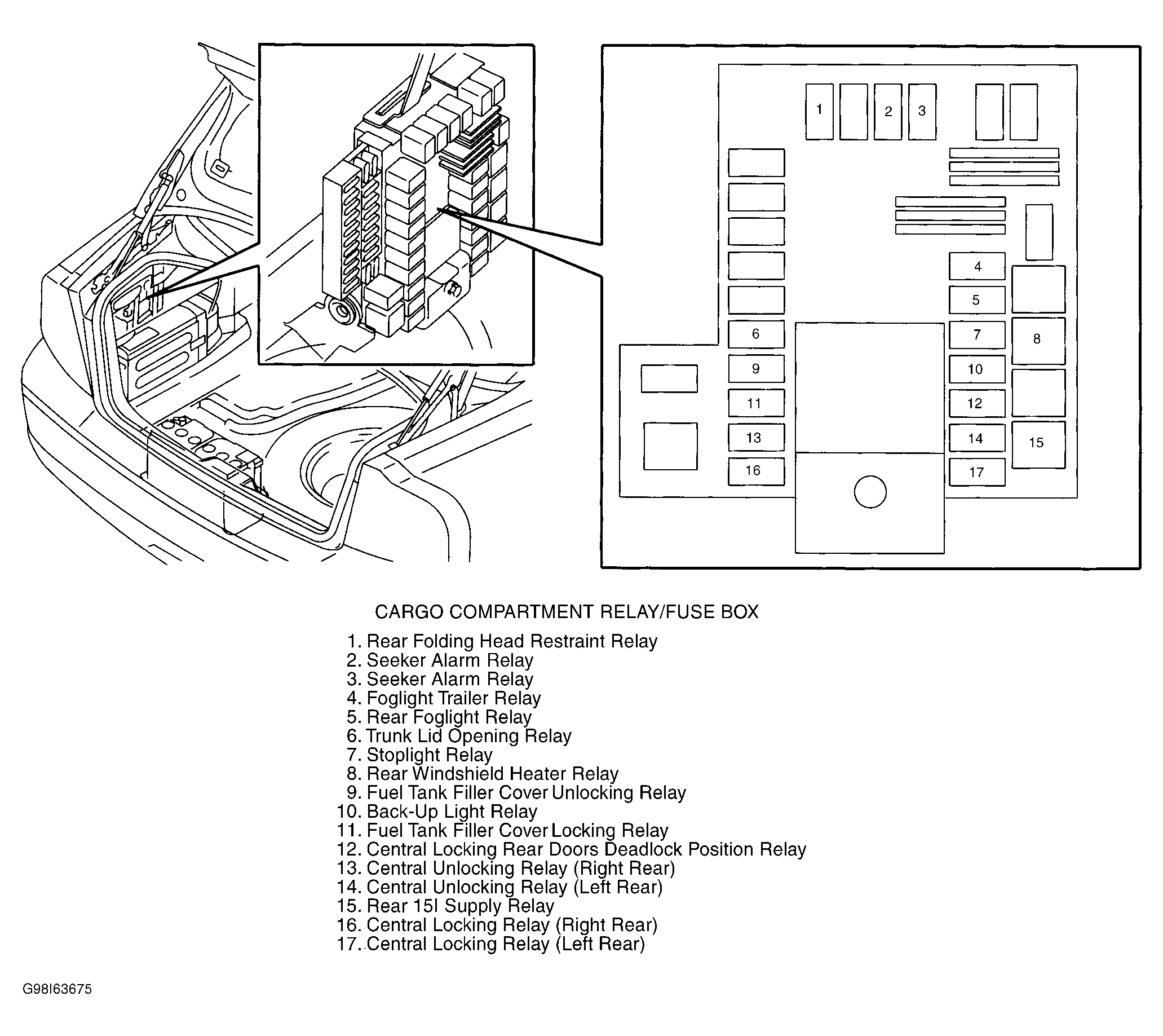 | Cargo Compartment Relay/Fuse Box | At left side of trunk. See Figure . |