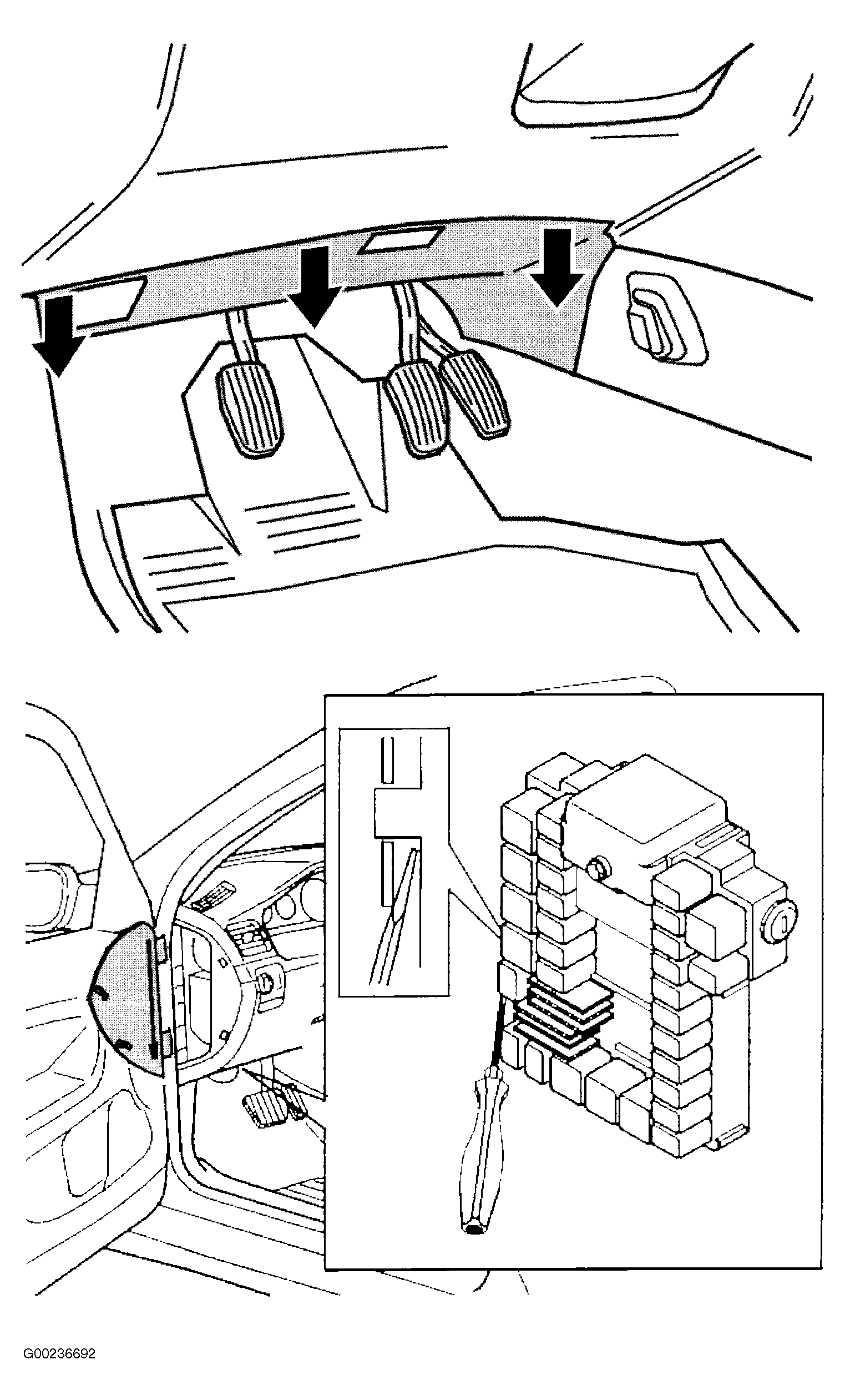 - Remove insulation panel on driver side. Panel sits in grooves at pedal box. Pull panel straight down at dashboard and then pull backward. Lift panel out. Remove side panel covering fuses on left side of dash. Insert a screwdriver between bracket and relay box and turn to open bracket. Pull relay box out of bracket toward underside of dash and lift box off bracket. Pull relay box out under dash. See Fig 1.