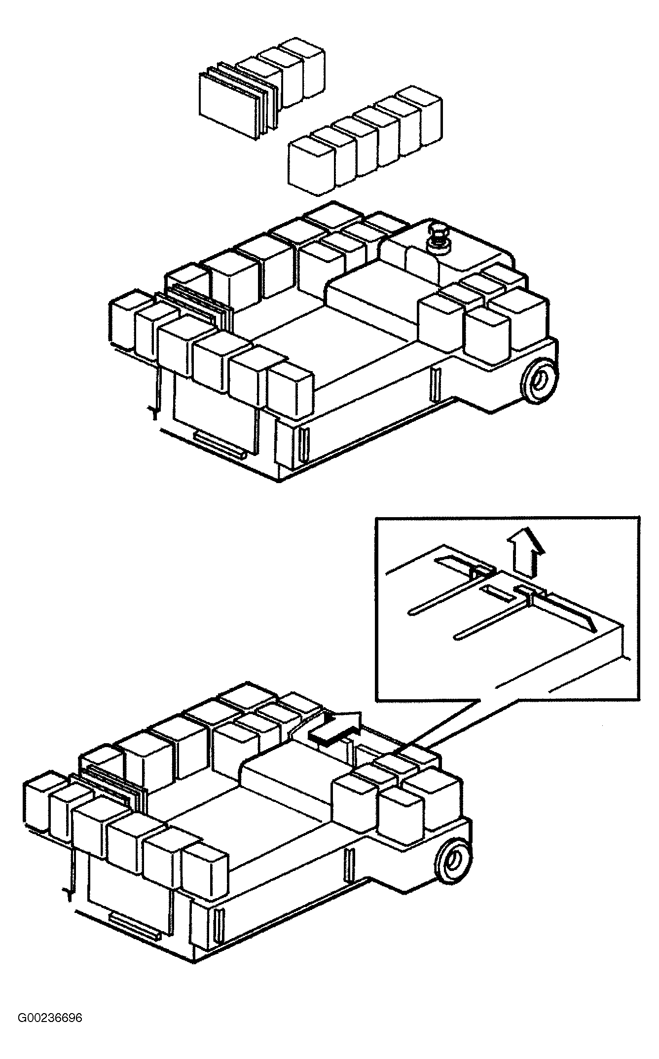 - Remove relays and shunts attached to control module. Record each location. Release catch at rear. Use a screwdriver to lift catch and pull out control module. See Fig 2.