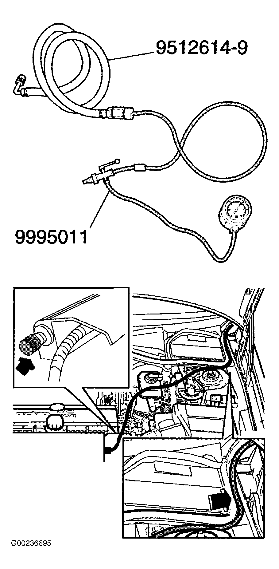 - Remove fuel rail cover. Connect Fuel Gauge (999-5011), or equivalent, to Adapter Hose (951-2614), or equivalent. See Fig 1.CAUTION: Ensure that hose follows rubber intake plenum trim and exits engine bay at rear corner of hood. Fuel gauge "T" valve MUST be outside closed hood. Incorrect arrangement will cause vehicle damage.