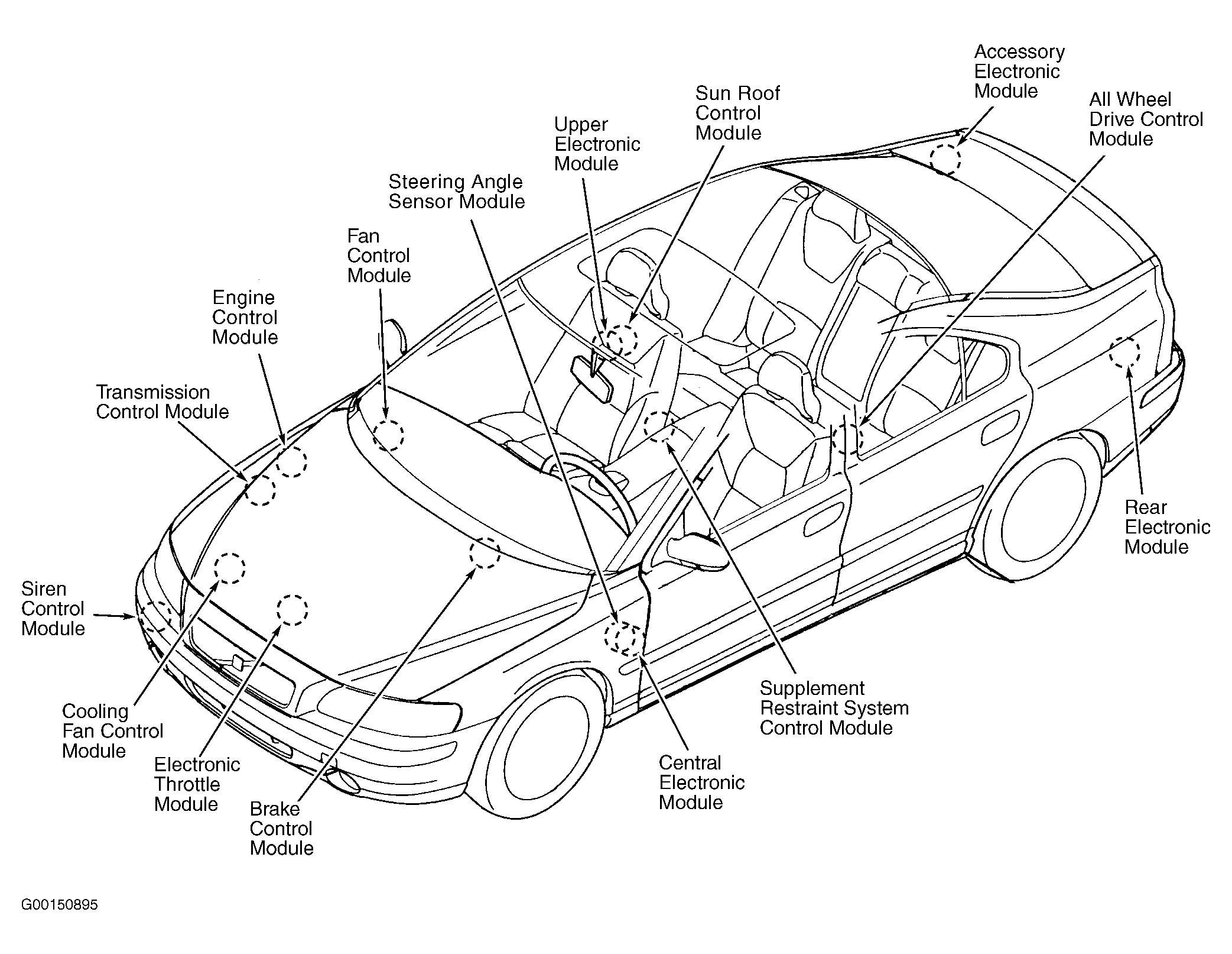 Supplemental Restraints System Control Module Below rear of center console. See Figure .