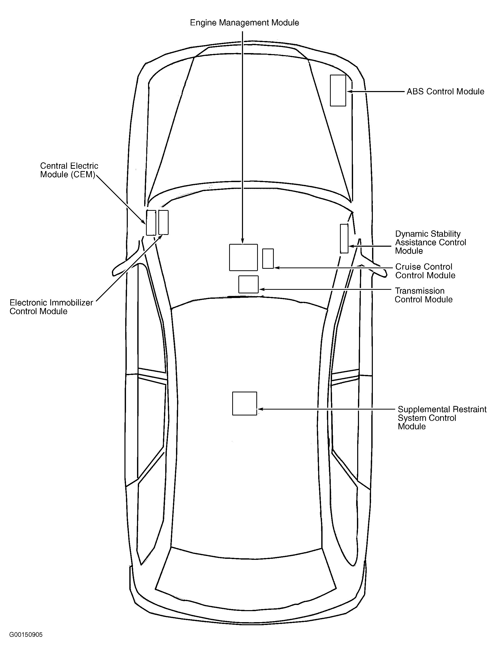 Supplemental Restraint System Control Module Below rear of center console, between front seats. See Figure .