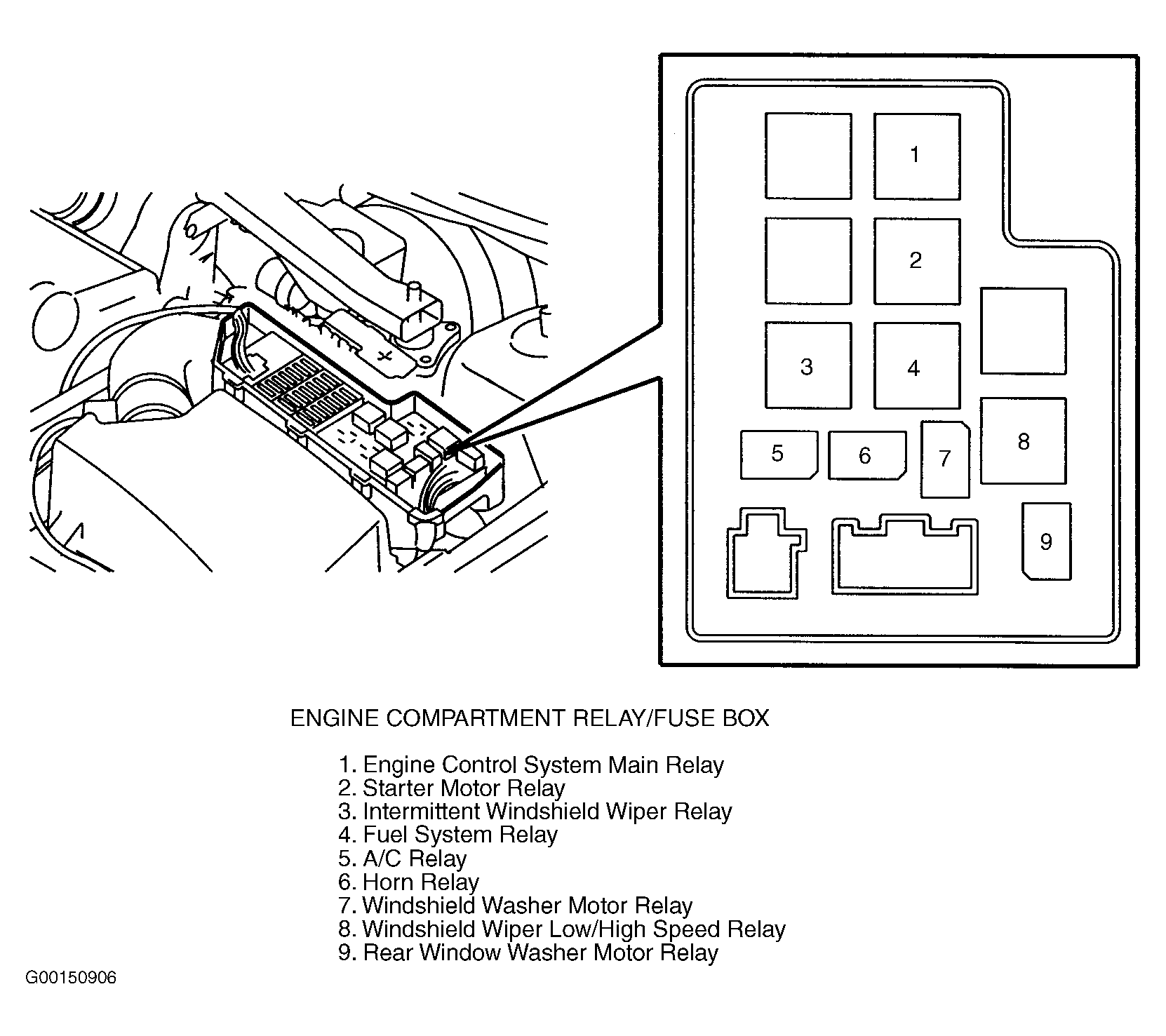 | Engine Compartment Relay/Fuse Box (C70) | On left rear of engine compartment, beside strut tower. See Figure . |