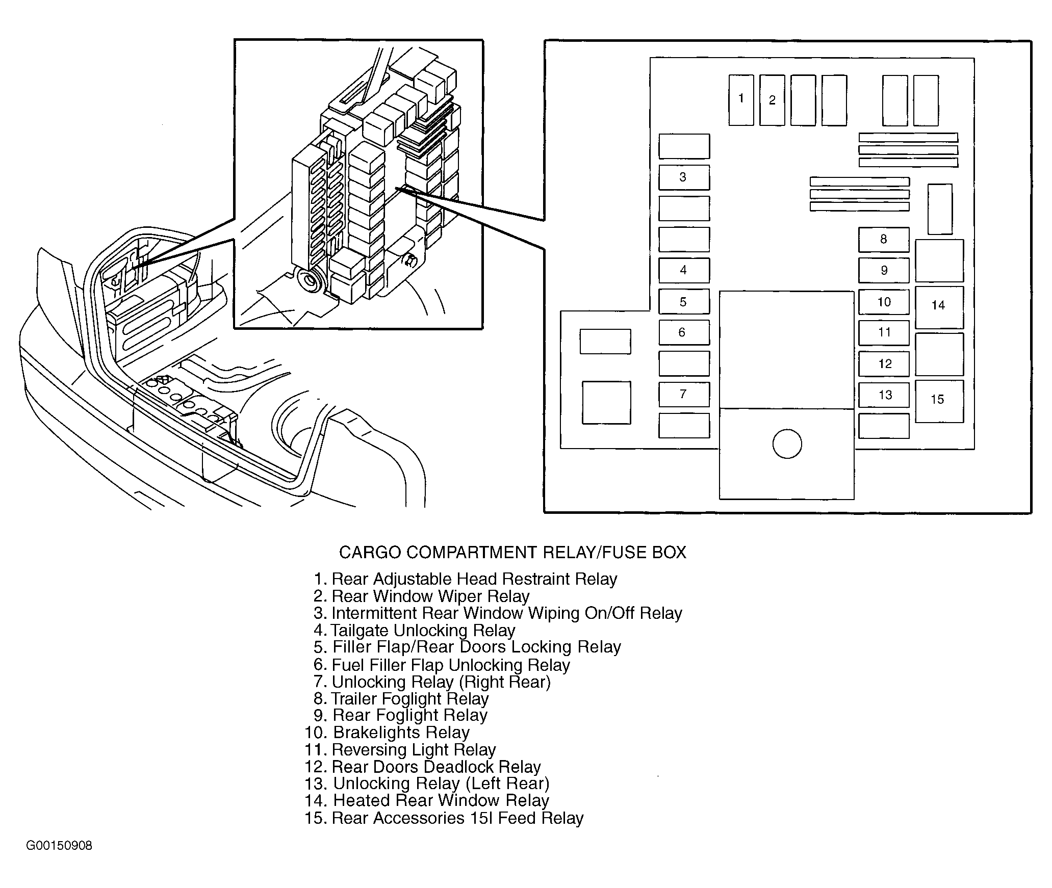 | Cargo Compartment Relay/Fuse Box | At left side of trunk. See Figure . |