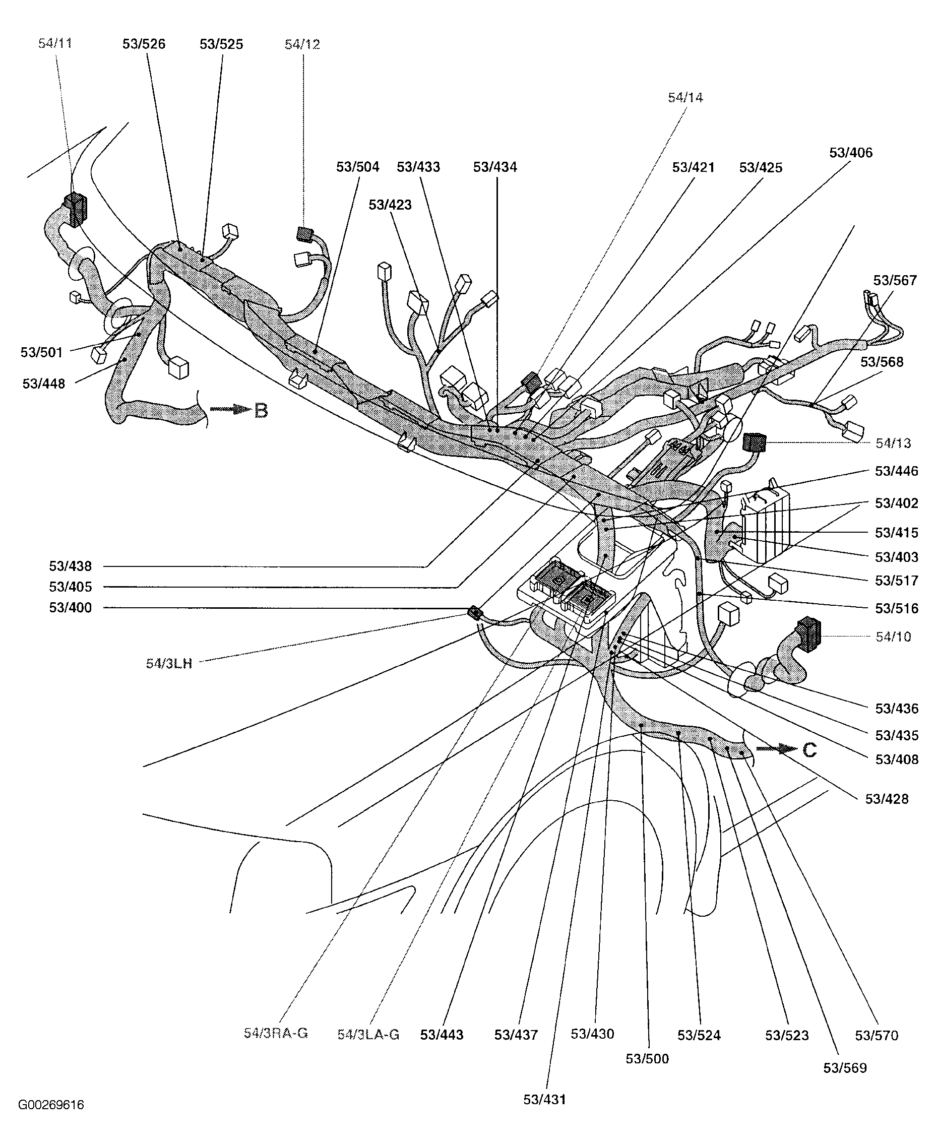 | 53/571 | In roof harness, above left "C" pillar. See Figure. |