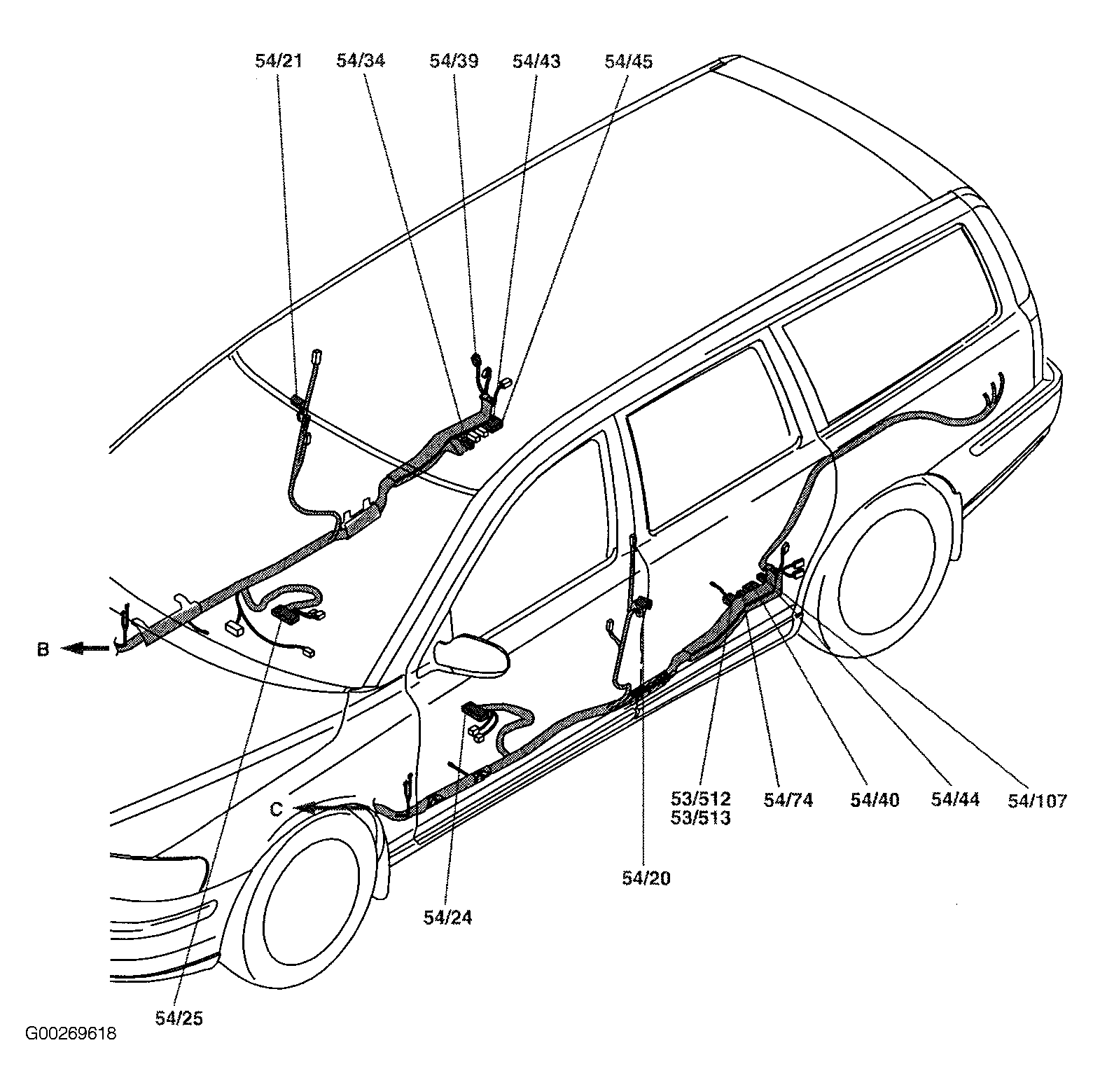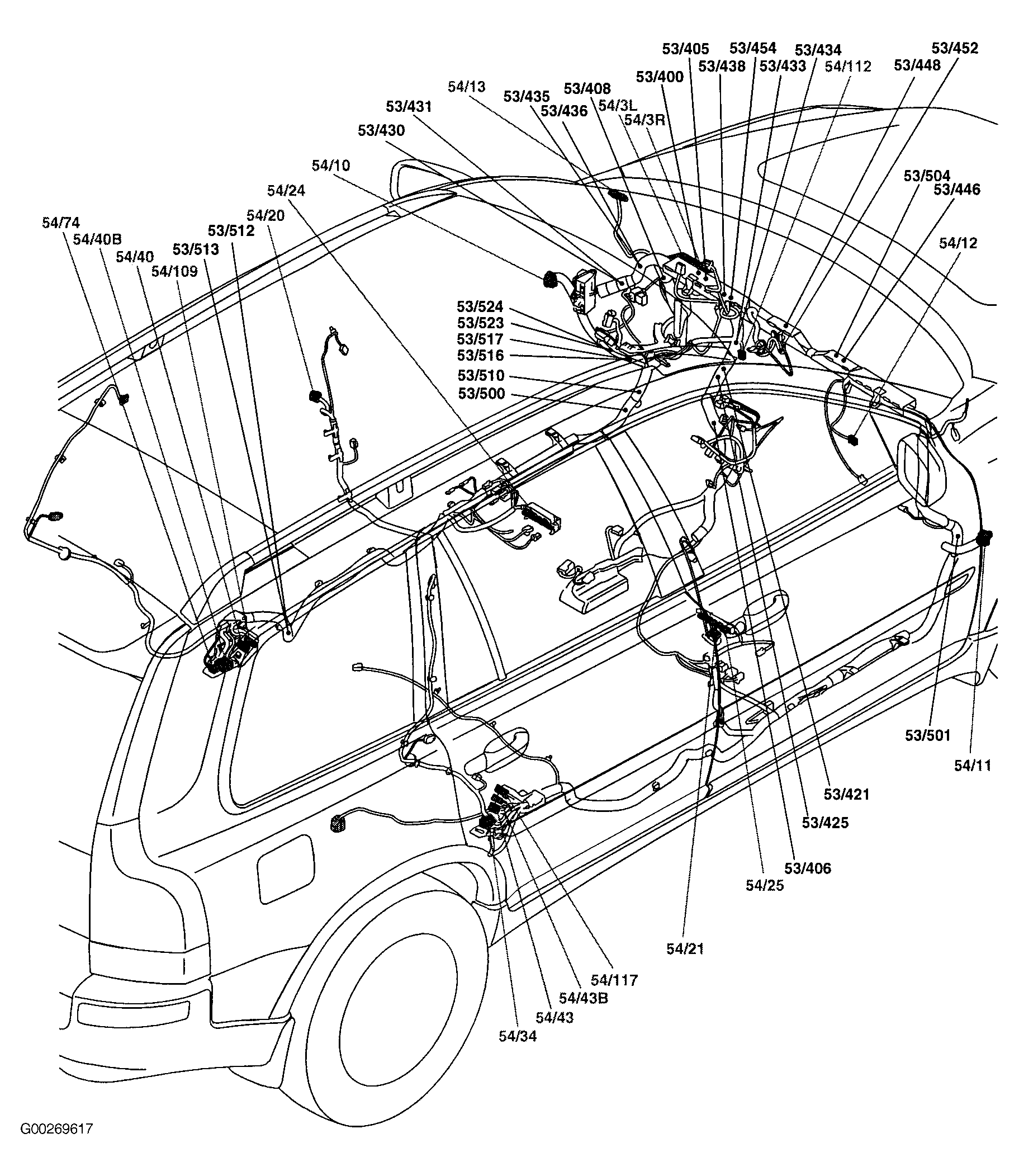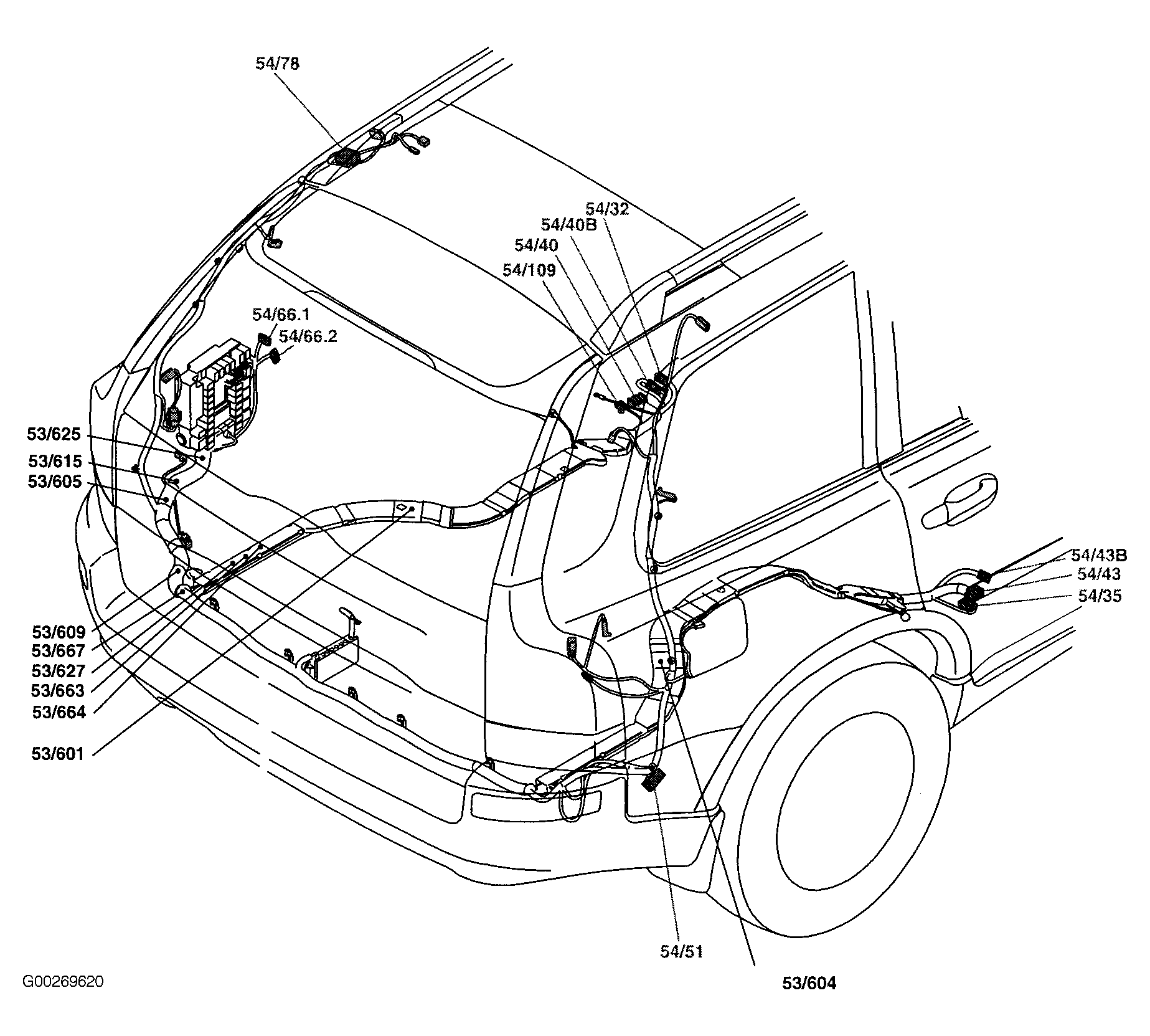 | 53/664 (XC90) | In cargo compartment harness, at left rear corner of cargo compartment. See Figure. |
