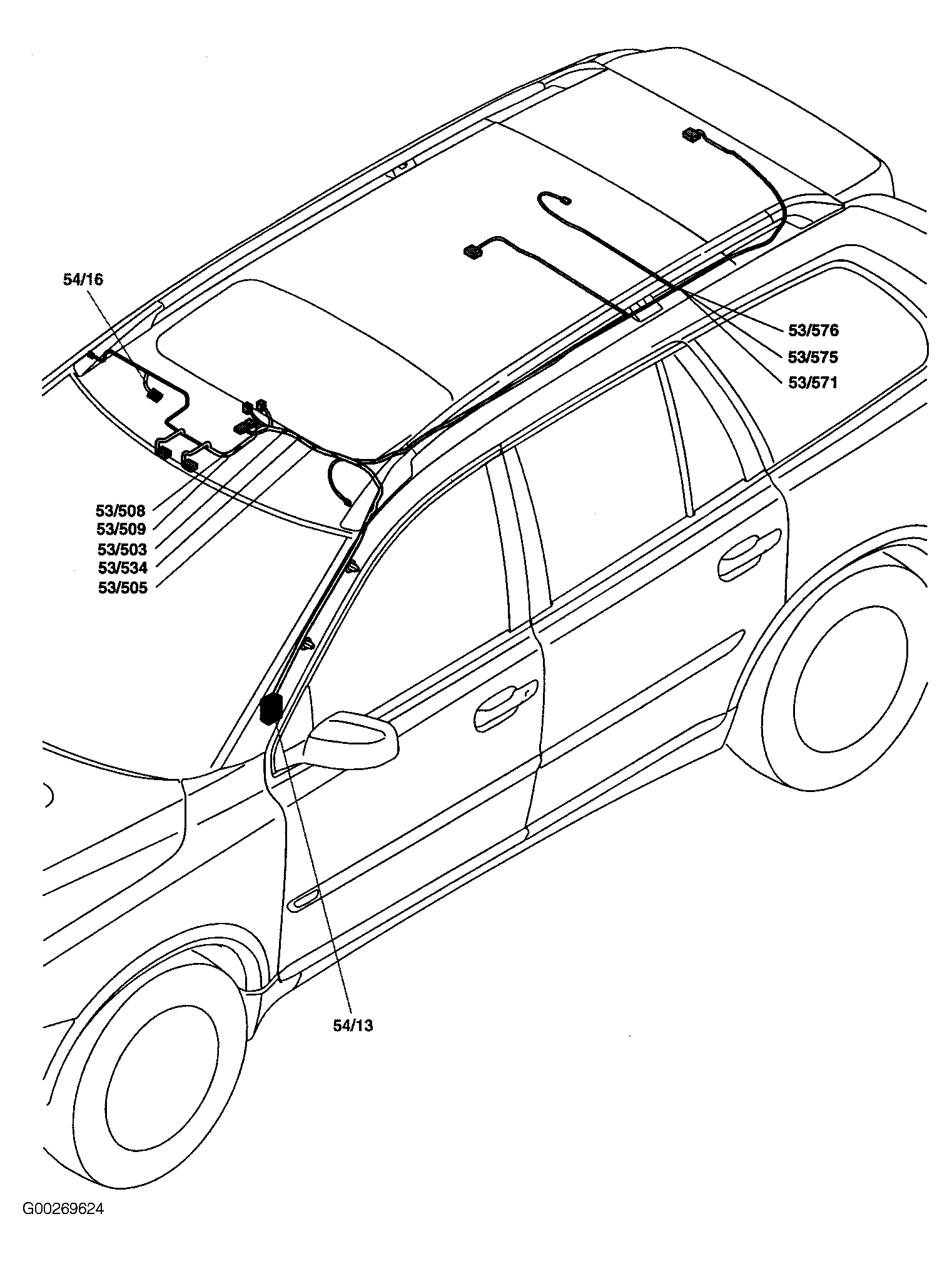 | 53/534 (XC90) | In roof harness, at left front of roof. See Figure. |