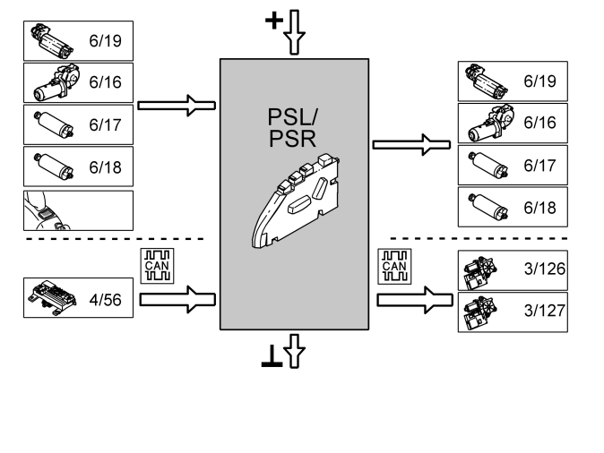The table below summarizes the input signals to and output signals from the power seat module, left (PSL) (3/26) and power seat module, right (PSR) (3/27). The signal types are divided into directly connected signals and CAN communication. The illustration below (Fig 1) displays the same information with the Volvo component designations.