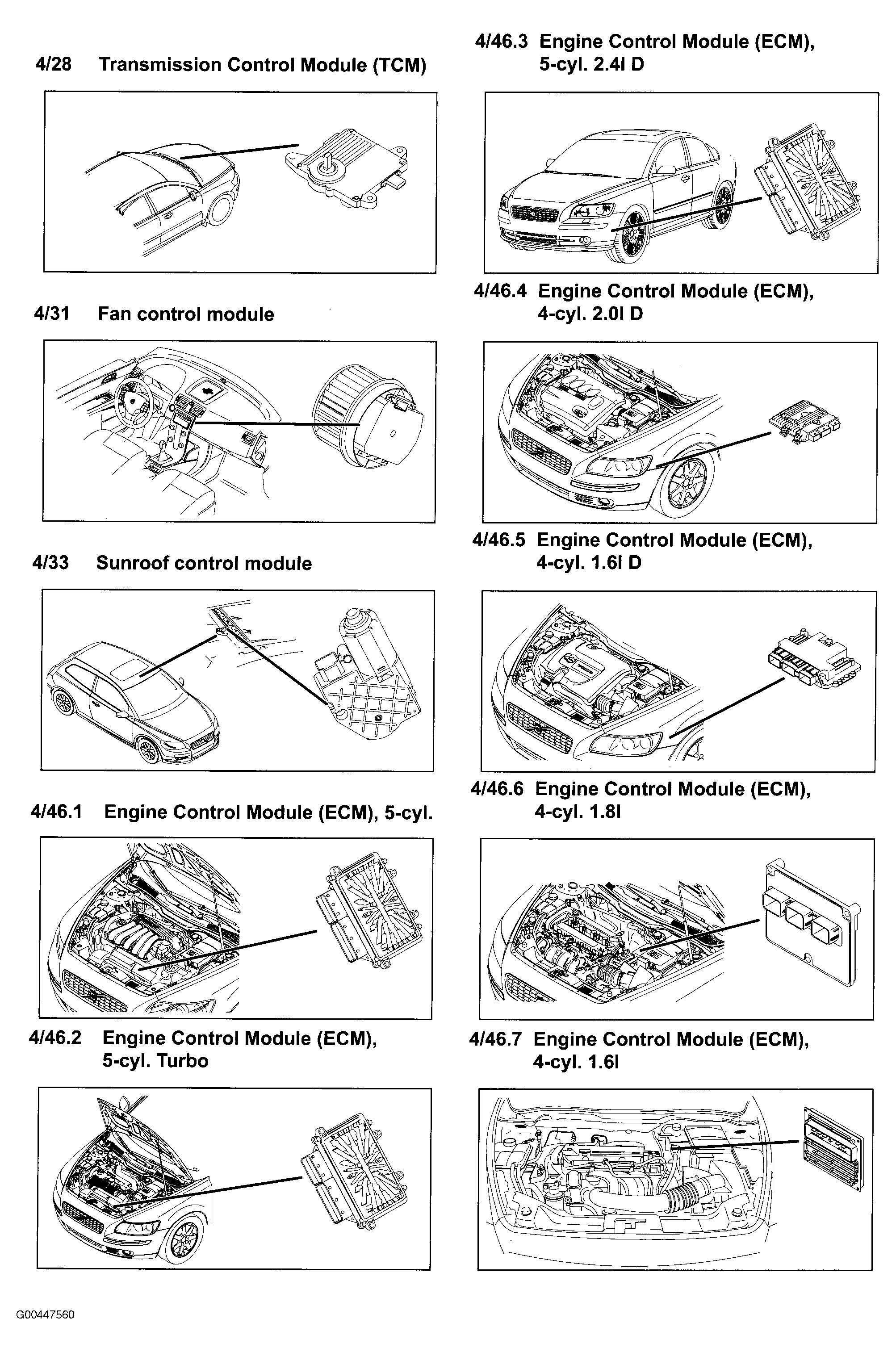 | Engine Control Module (ECM) (4/46.2) | Left front of engine compartment. See Figure. |