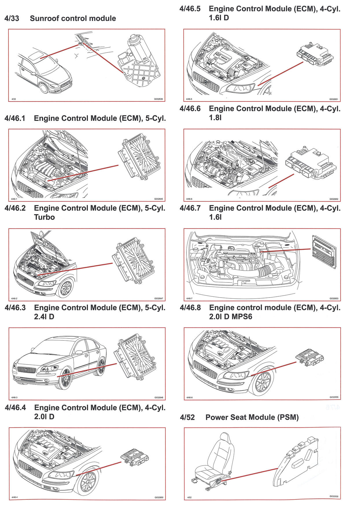 | Engine Control Module (ECM) (4/46.2) | Left front of engine compartment. See Figure. |