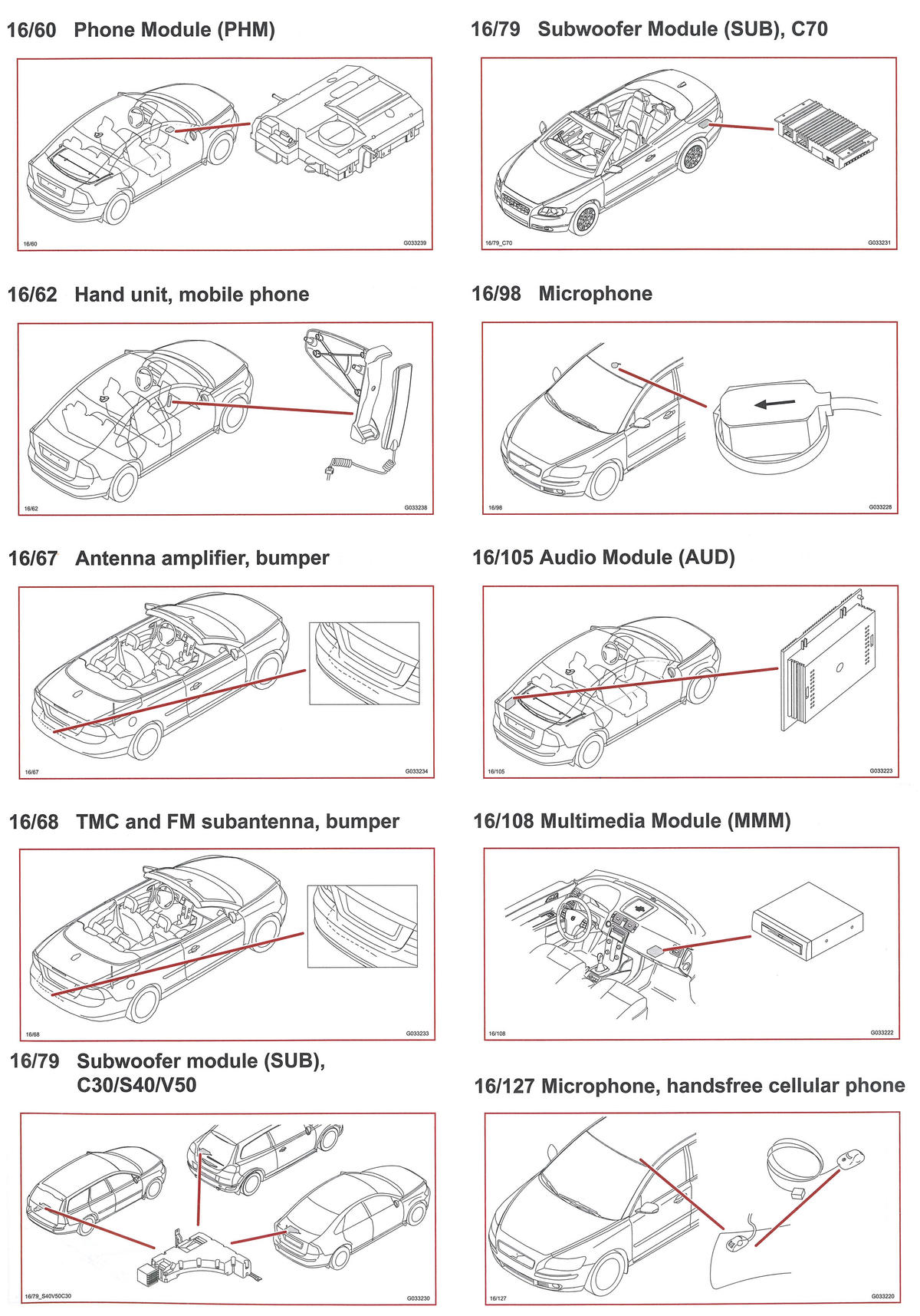 | Subwoofer Module (SUB) (16/79) | Left side of luggage compartment. See Figure. |