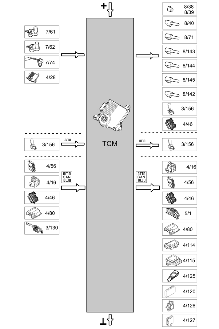 The table below summarizes the input and output signals to and from the transmission control module (TCM). The signal types are divided into directly connected signals, serial communication and CAN communication. Fig 1 displays the same information with Volvo component designations.