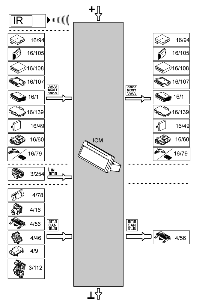 The table below summarizes the input signals to and output signals from the infotainment control module (ICM). The signal types are divided into infrared signals (IR), MOST communication, LIN communication and CAN communication. The illustration below (see Fig 1) displays the same information with the Volvo component designations.