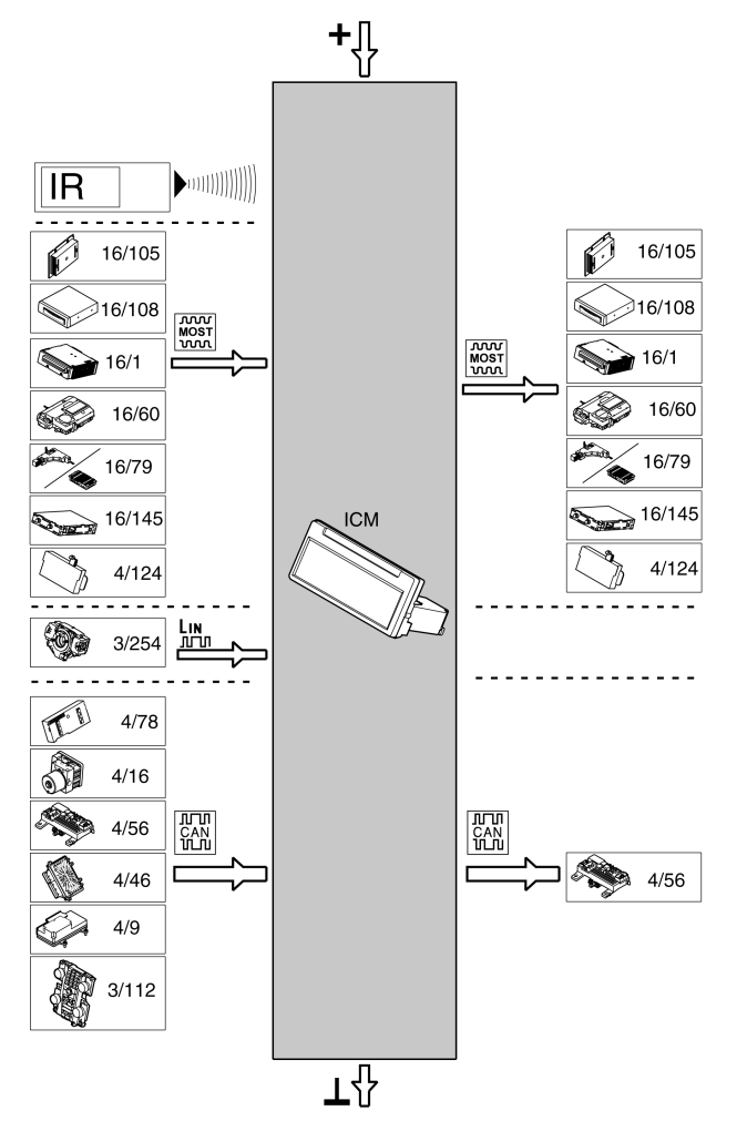 The table below summarizes the input signals to and output signals from the infotainment control module (ICM). The signal types are divided into infrared signals (IR), MOST communication, LIN communication and CAN communication. The illustration below (see Fig 1) displays the same information with the Volvo component designations.