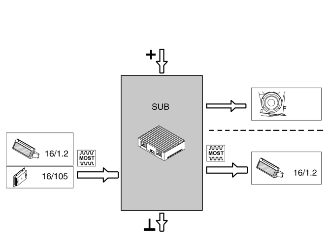 The table below summarizes the input signals to and output signals from the Subwoofer module (SUB). The signal types are divided into directly connected signals and MOST communication. The illustration below (Fig 1) displays the same information with the Volvo component designations.