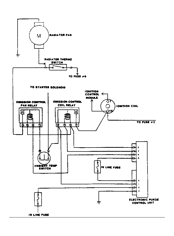 The Electronic Purge Control Unit (EPCU) disconnects battery voltage from the radiator cooling fan relay after about 7 minutes of operation, turning off the radiator cooling fan. The EPCU is operated by battery voltage and ignition voltage. The ignition voltage activates a small relay located in the EPCU which allows the cooling system to operate normally under engine operation, battery voltage controls purge operation with ignition off.