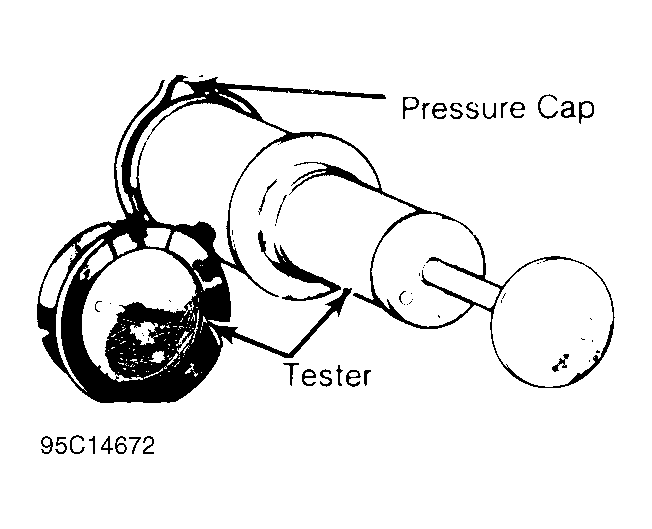 Visually inspect radiator cap. If cap looks okay, connect pressure tester to cap. See Fig 1. Pressurize tester to full radiator cap specification. Replace cap if it fails to hold pressure.